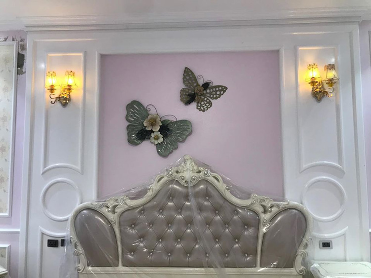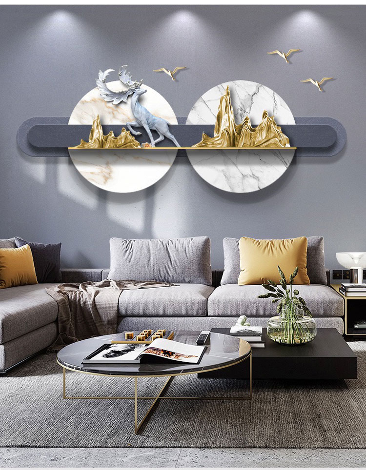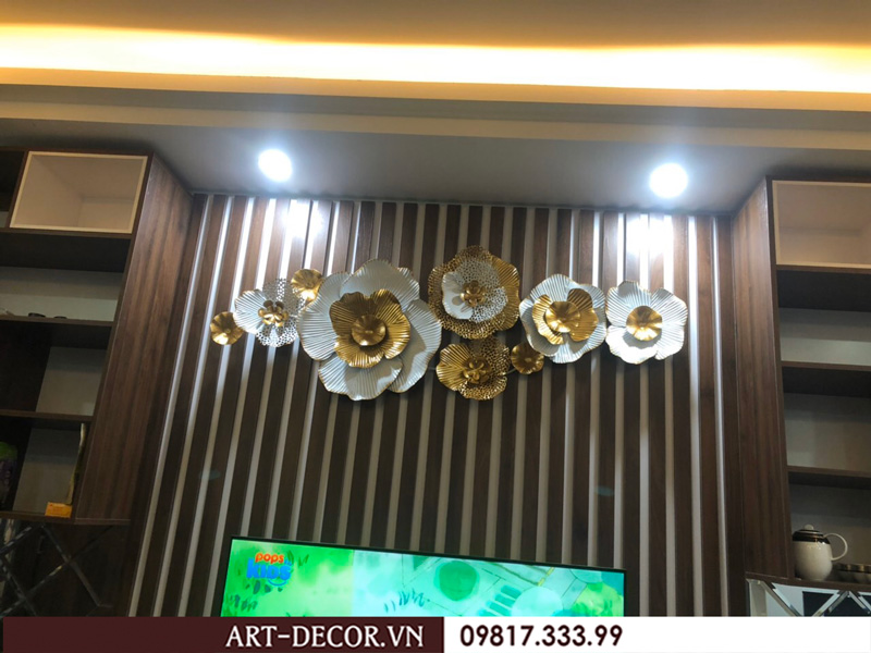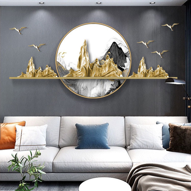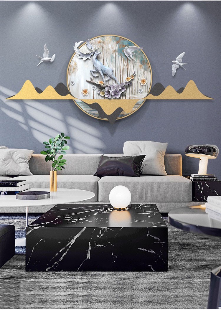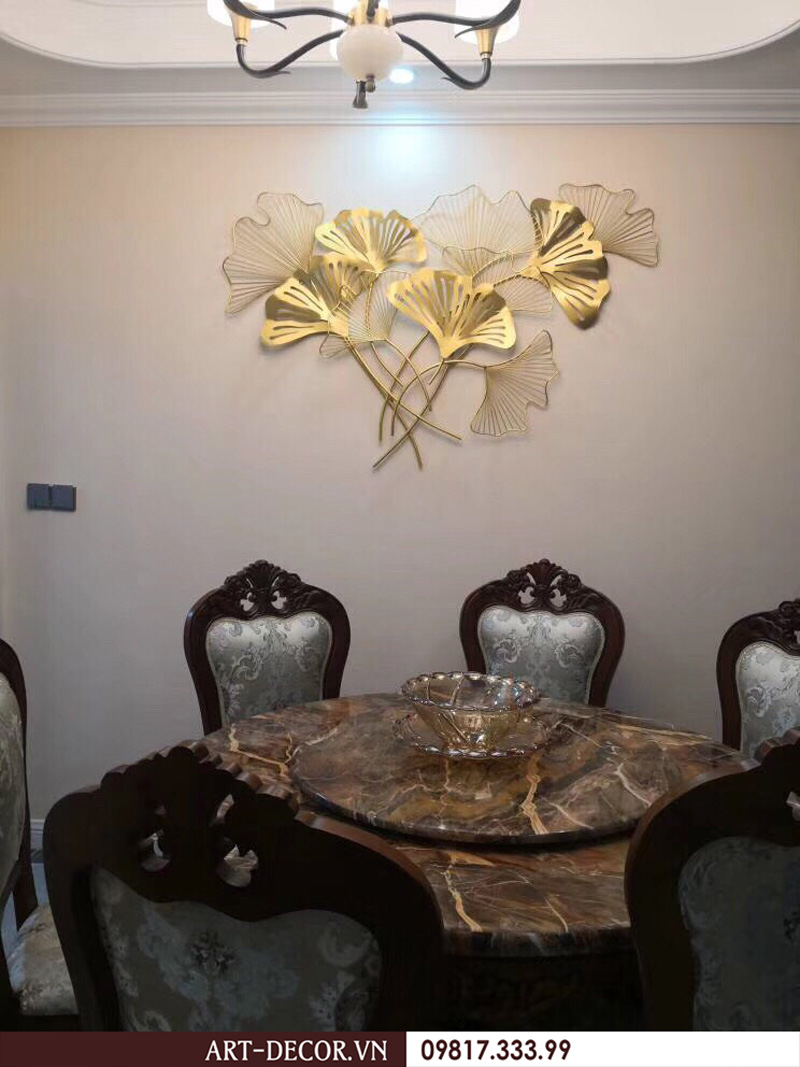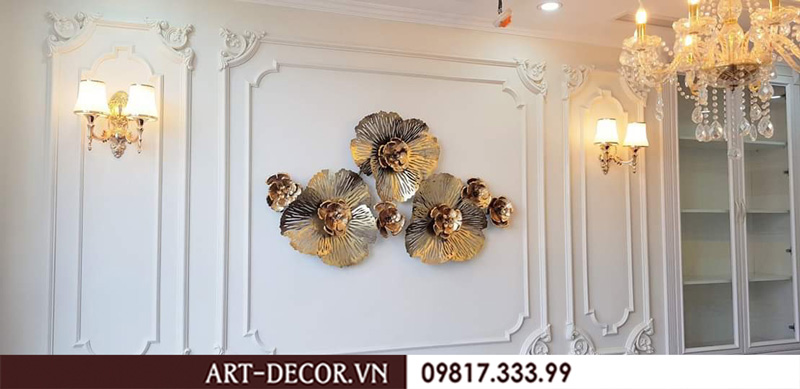 Tranh sắt là những tác phẩm được thiết kế từ sắt không rỉ, sơn tĩnh điện. Bố cục không gò bó, kích thước đa dạng chính là ưu điểm của loại tranh này. Với tông màu trầm ấm của bàn ghế, không gian tinh tế của những chiếc đèn chùm thì màu vàng đậm, bạch kim, xanh ngọc,…của tranh sắt treo tường khiến phòng khách trở nên lung linh kỳ lạ. Các chuyên gia thiết kế nội thất khuyến khích sử dụng tranh trang trí nội thất đẹp như một cách thưởng thức nghệ thuật. Không gian phòng khách là không gian mang hơi hướng Tây Âu pha chút lãng mạn.